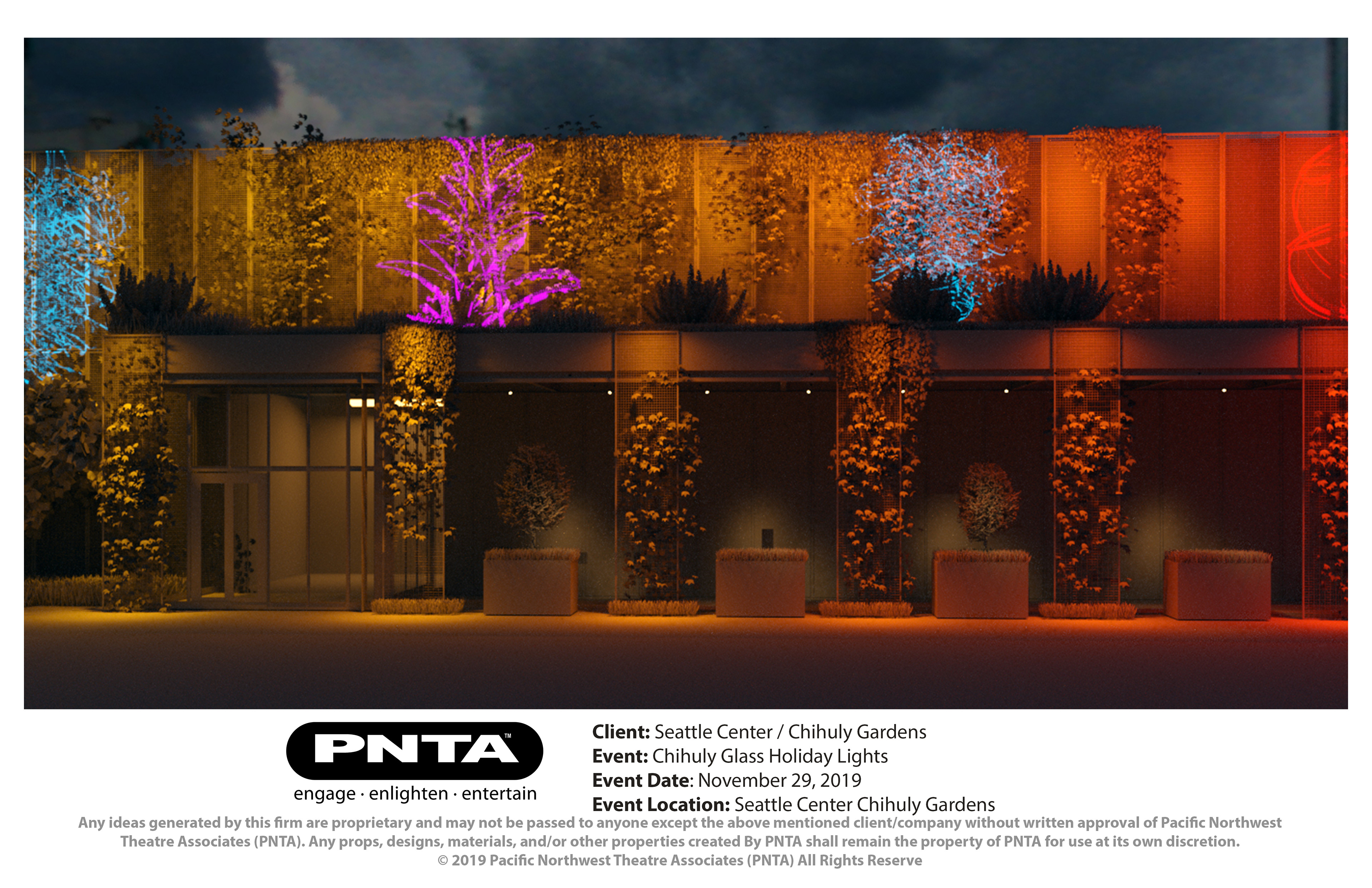 Chihuly Glass and Gardens approached PNTA in the fall of 2019 to support with lighting the gardens for an experiential art activation and to highlight and accompany the incredibly impressive work of Dale Chihuly showcased in the outdoor space of their museum. The project presented some unique challenges which included working in a tight space, hanging lighting from locations with no firm hang points, and lighting the space with little to no impact on the garden and the flora.